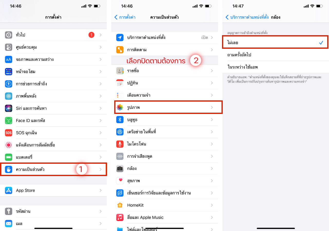 ไปที่การตั้งค่า (Setting) > ความเป็นส่วนตัว (Privacy) > เลือกแอปที่ต้องการปิดบริการตำแหน่งที่ตั้ง (ในตัวอย่างเป็นแอปรูปภาพ) > เลือกปิดบริการตำแหน่งที่ไม่จำเป็น