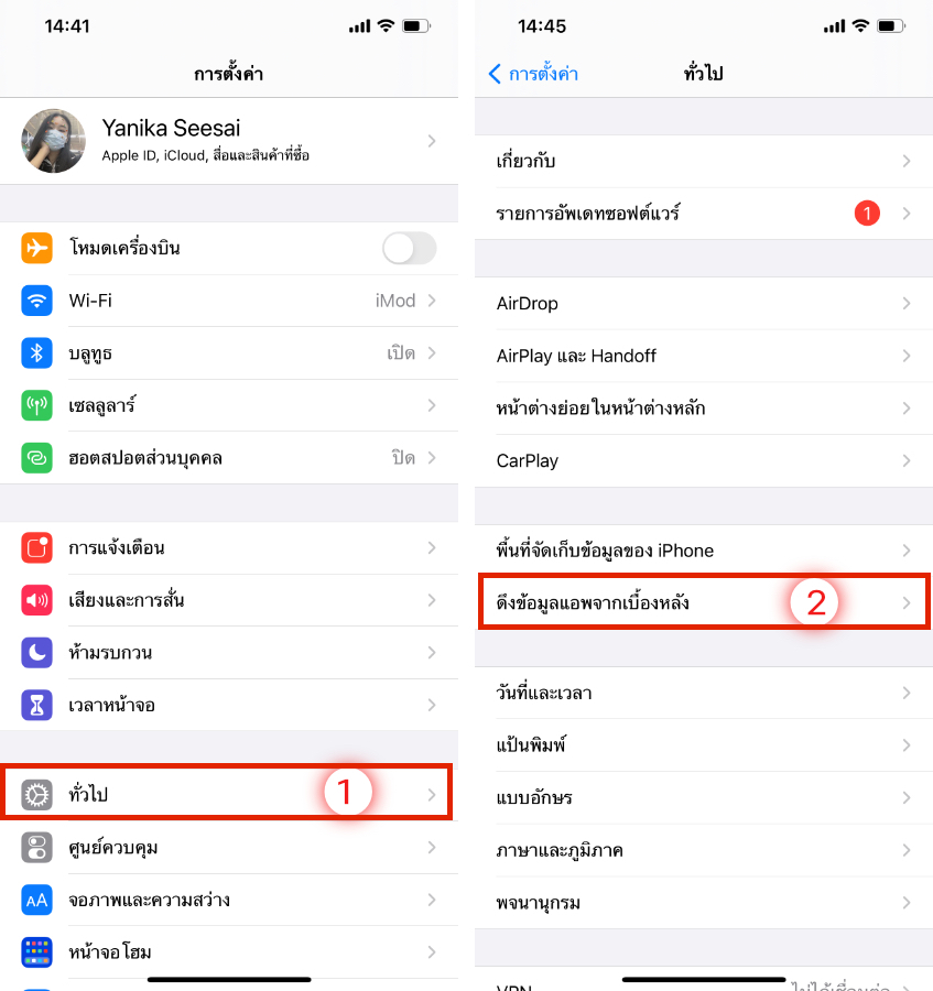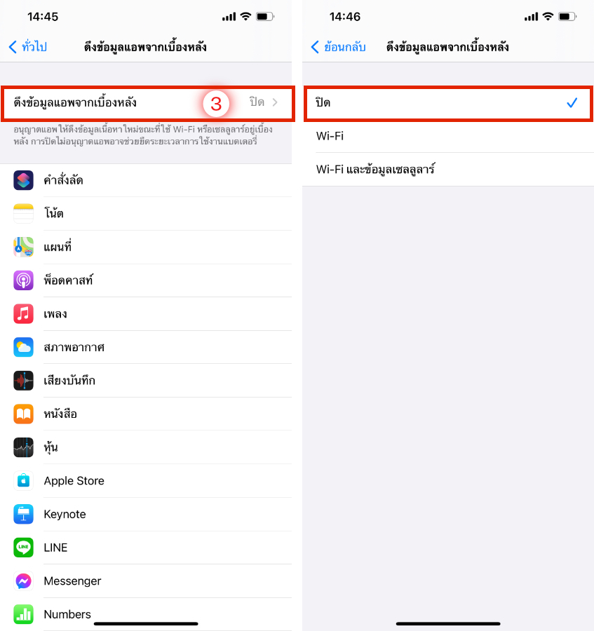 การตั้งค่า (Setting) > ทั่วไป (General) > การดึงข้อมูลแอปจากเบื้องหลัง (Back Ground App Refresh)