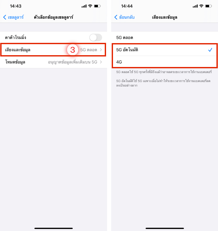 > เสียงและข้อมูล (Voice & Data) > เลือกใช้ 5G อัตโนมัติ (5G Auto) หรือ 4G