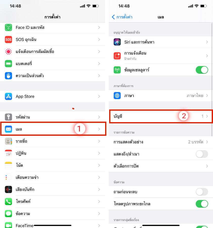 การตั้งค่า (Setting) > เมล (Mail) > บัญชี (Acconts)