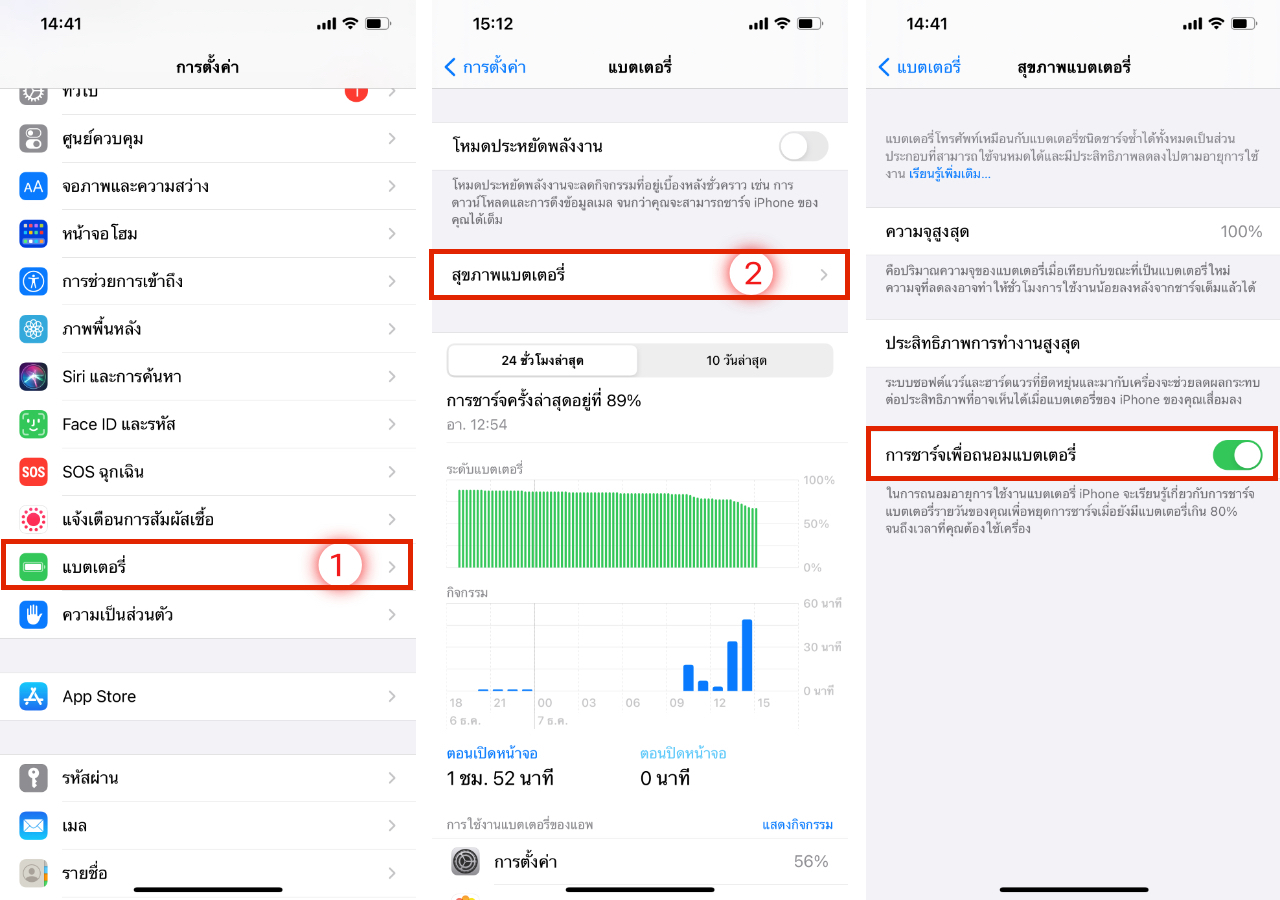 การตั้งค่า (Setting) > แบตเตอรี่ (Battery) > สุขภาพแบตเตอรี่ (Battery Health) > เปิดการชาร์จเพื่อถนอมแบตเตอรี่ (Optimized Battery Charging)