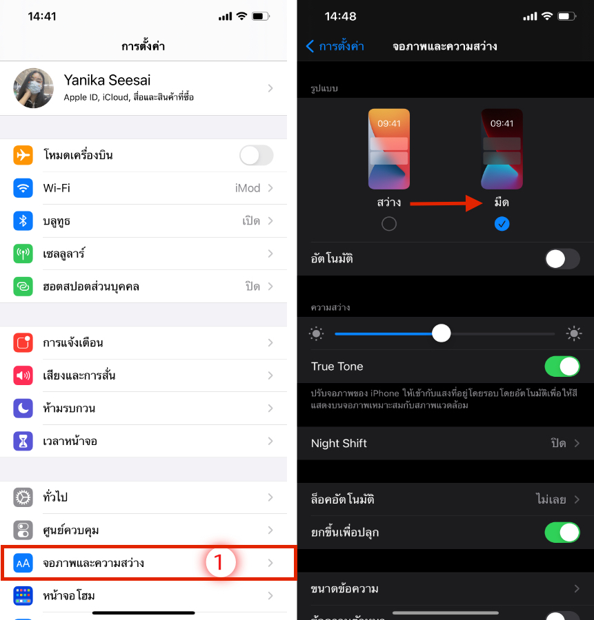 การตั้งค่า (Setting) > จอภาพและความสว่าง (Display & Brightness ) > เลือกใช้รูปแบบ “มืด (Dark)”