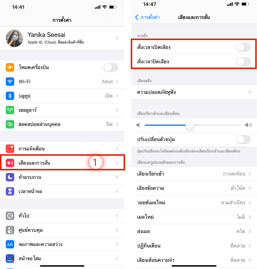การตั้งค่า (Setting) > เสียงและการสั่น (Sound & Haptics) > ปิดการสั่นเวลาเปิดเสียง (Vibrate on Ring) และการสั่นเวลาปิดเสียง (Vibrate on Silent )