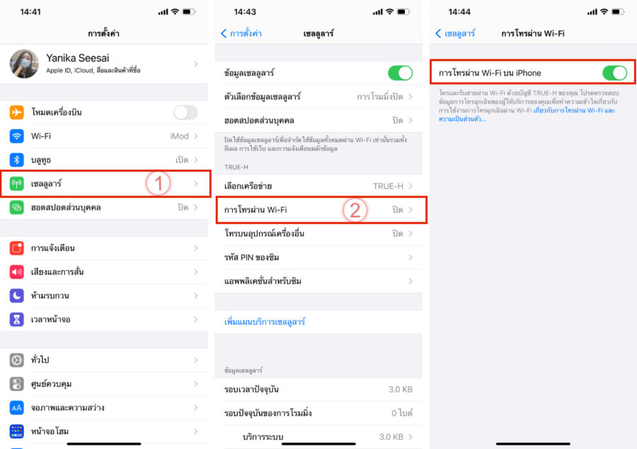 การตั้งค่า (Setting) > เซลลูลาร์ (Cellular) > แตะเลือกการโทรผ่าน Wi-Fi (Wi-Fi Calling) > เปิดการโทรผ่าน Wi-Fi