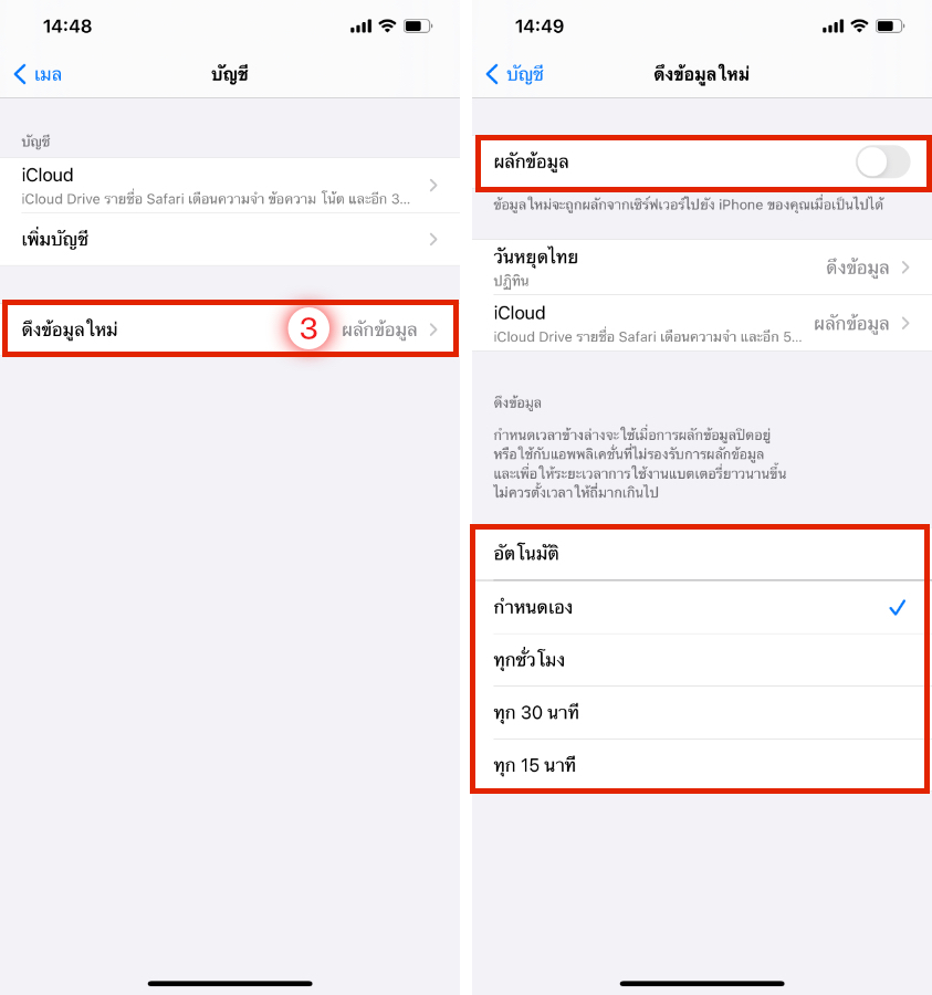 > ดึงข้อมูลใหม่ (Fetch New Data) > ปิดการผลักข้อมูล / เลือกใช้การดึงข้อมูลแบบกำหนดเอง (Manually)