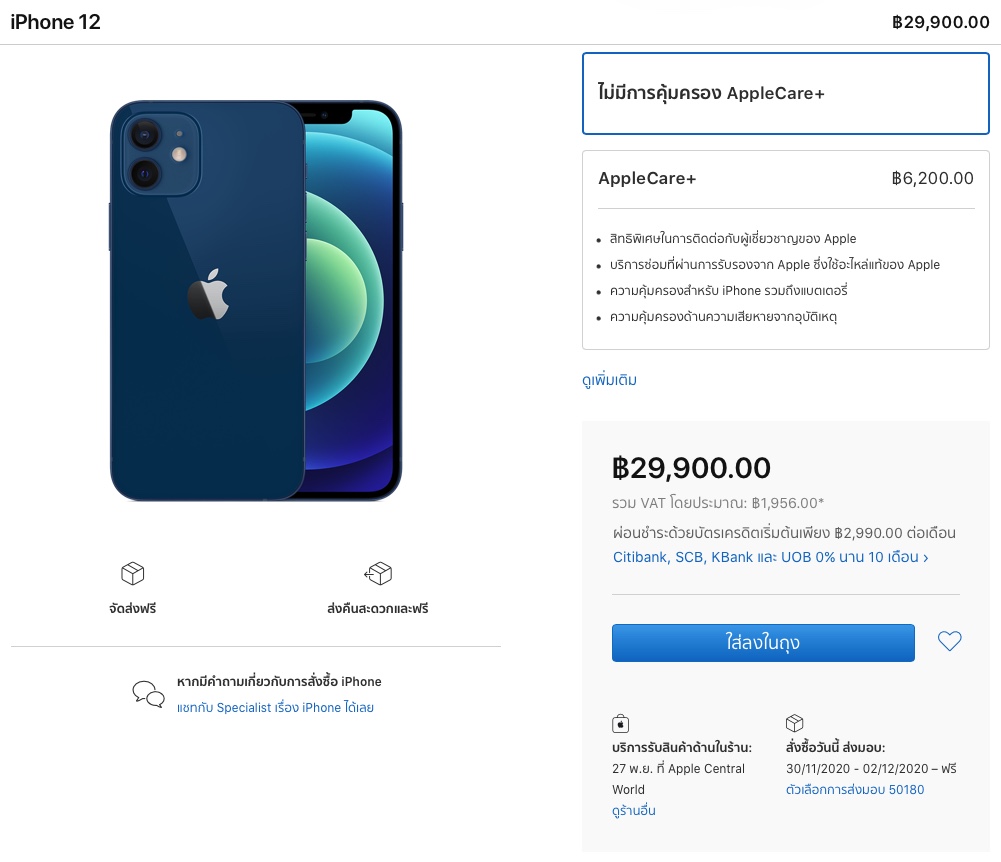 20 พ.ย. 63, Apple ได้เปิดให้ลูกค้ากดสั่งซื้อ iPhone 12 ทุกรุ่นล่วงหน้าแล้ว, iPhone 12 mini เริ่มต้น 25,900 บาท, iPhone 12 เริ่มต้น 29,900 บาท, iPhone 12 Pro เริ่มต้น 36,900 บาท, iPhone 12 Pro Max เริ่มต้น 39,900 บาท