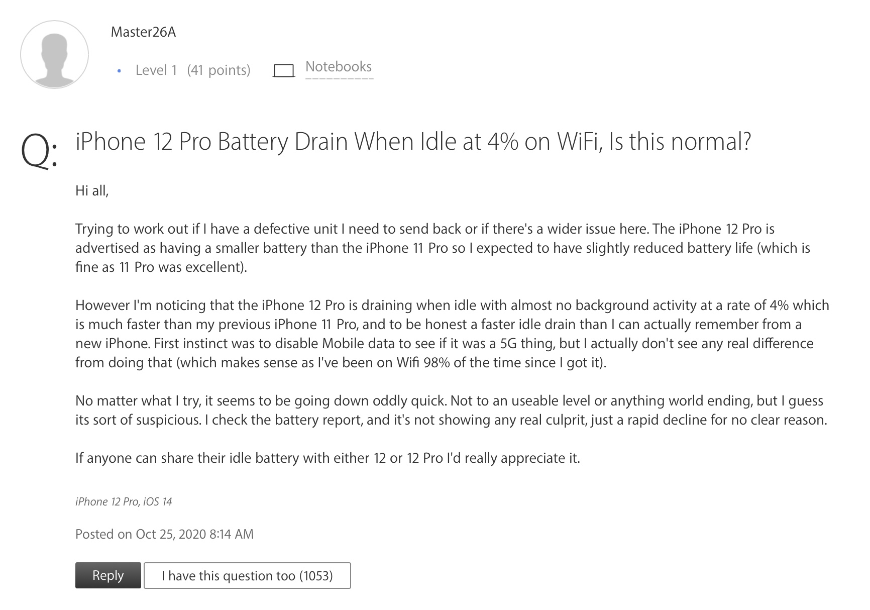 Master26A หนึ่งในผู้รายงานปัญหาที่ Apple Forum เผยว่าตัวเขาเองใช้ iPhone 12 Pro แล้วเจอปัญหาแบตหมดไว ลงไปชั่วโมงละ 4% ถึงแม้จะ Standby เครื่องไว้