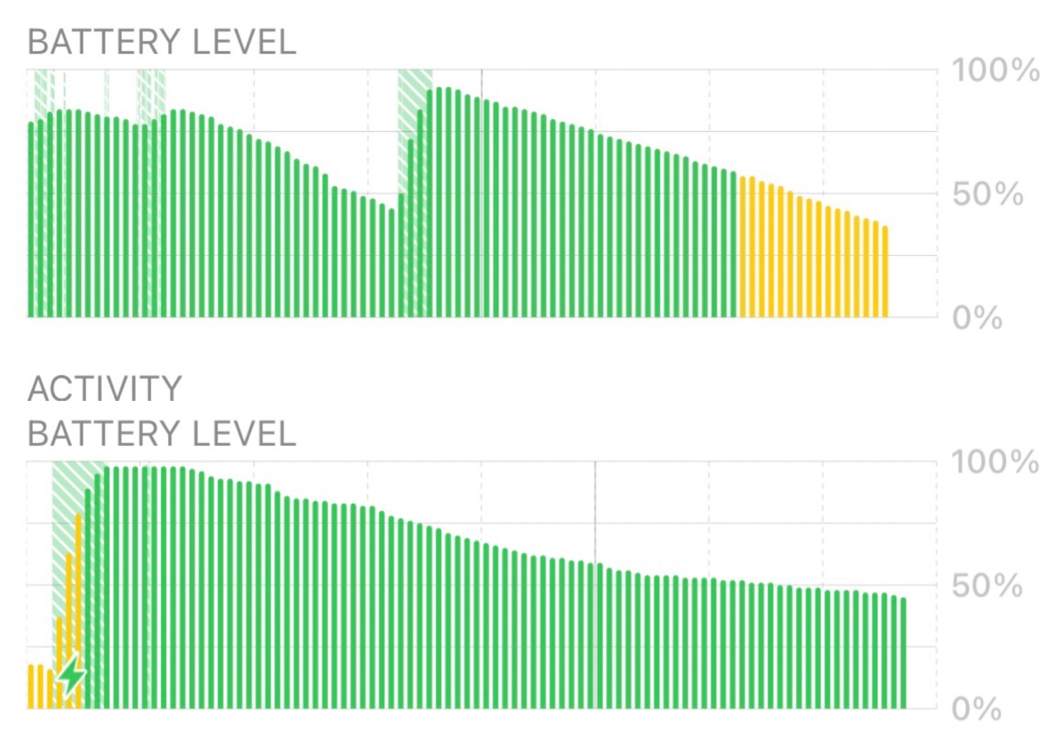 วิศวกรรายหนึ่งเผยภาพเปรียบเทียบการใช้งานแบต โดยภาพบนนั้นแสดงให้เห็นแบตที่ลดลงแบบผิดปกติ (ถึงแม้จะเปิด Low Power แล้ว) เทียบกับภาพล่างที่เป็นแบตลดลงจากการใช้งานแบบปกติ