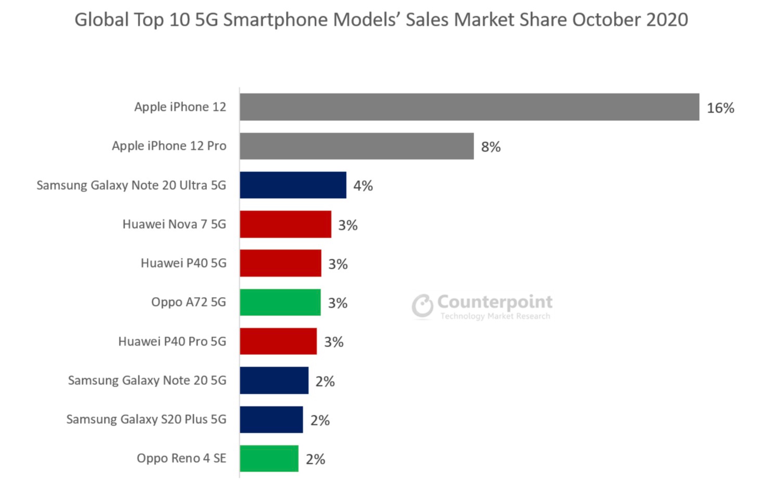 Apple เปิดขาย iPhone 12 ครั้งแรกในเดือน ต.ค., ถึงแม้จะเป็นเวลา 2 สัปดาห์ช่วงท้ายเดือน แต่ iPhone 12 ก็เป็นสมาร์ตโฟน 5G ขายดีที่สุดในเดือนนั้น และอยู่อันดับ 7 ในช่วงขายเดือน ม.ค. – ต.ค.