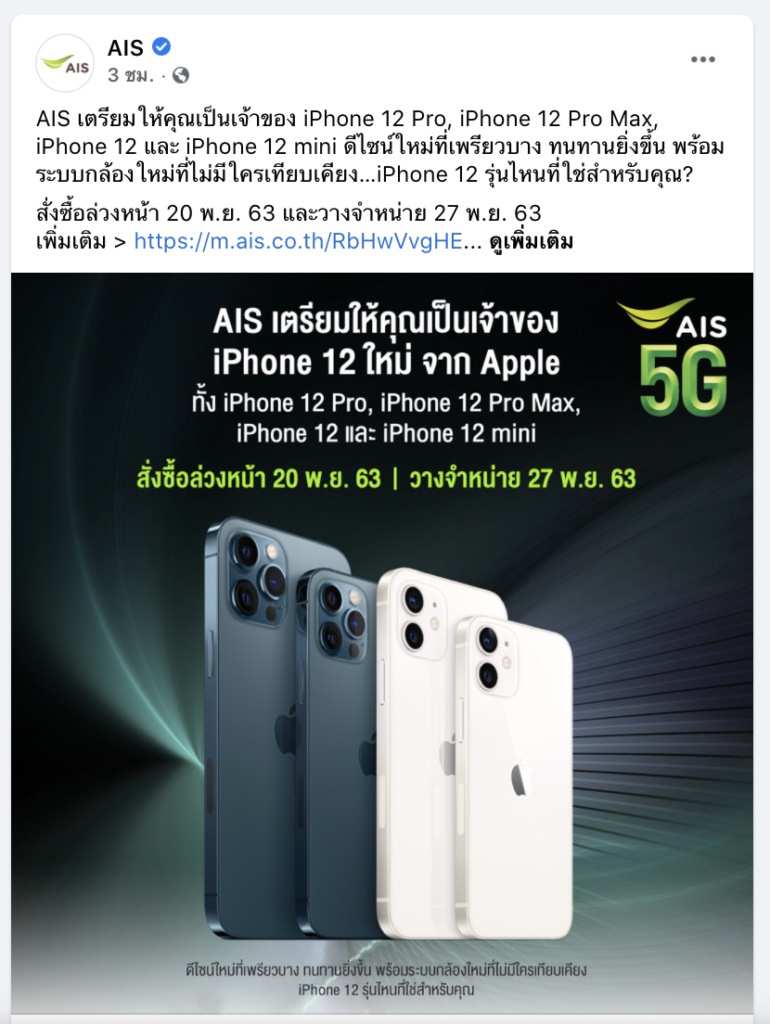 AIS เปิดให้สั่งซื้อ iPhone 12 mini, iPhone 12, iPhone 12 Pro และ iPhone 12 Pro Max ล่วงหน้าในวันที่ 20 พฤศจิกายน 2563 นี้ พร้อมวางจำหน่าย 27 พฤศจิกายนนี้