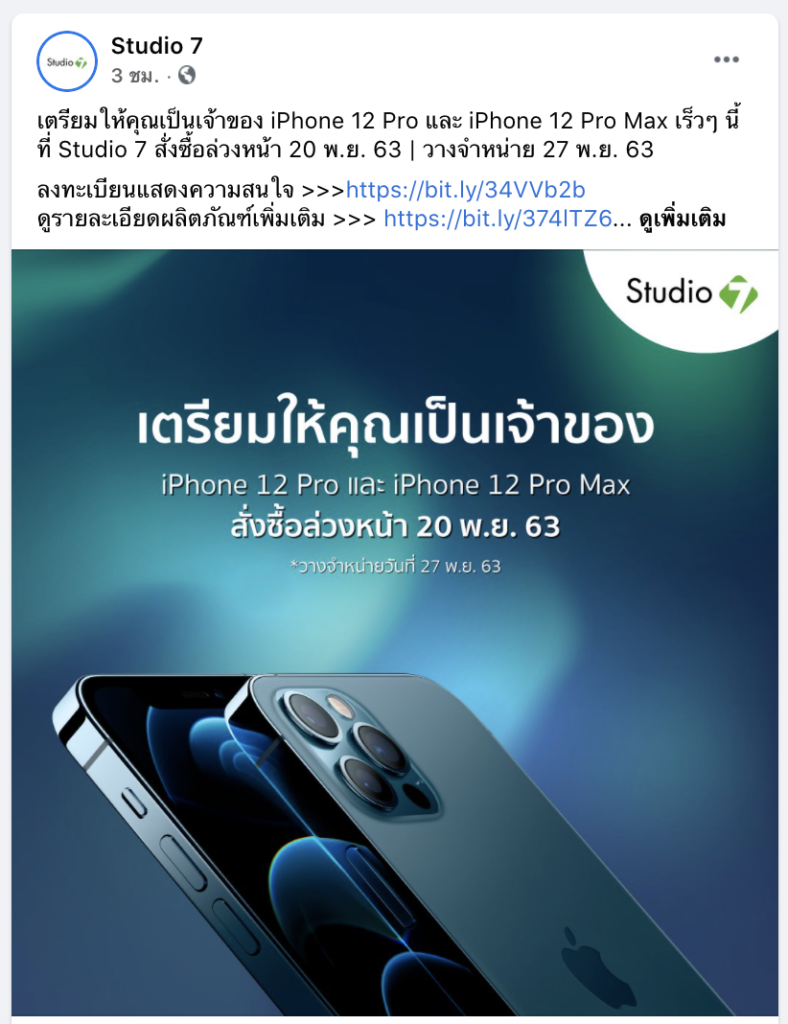 Studio 7 เปิดให้ลงทะเบียนแสดงความสนใจ iPhone 12 Pro และ iPhone 12 Pro Max ที่ https://bit.ly/34VVb2b และเปิดให้สั่งซื้อล่วงหน้าในวันศุกร์ที่ 20 พฤศจิกายน 2563