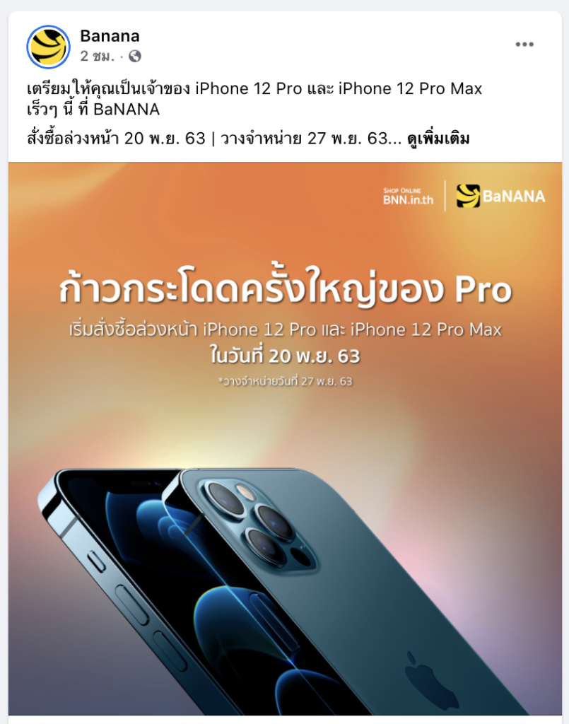 BaNANA เปิดให้ลงทะเบียนแสดงความสนใจ iPhone 12 Pro และ iPhone 12 Pro Max ที่ https://bit.ly/3jWMcnD และเปิดให้สั่งซื้อล่วงหน้าในวันศุกร์ที่ 20 พฤศจิกายน 2563