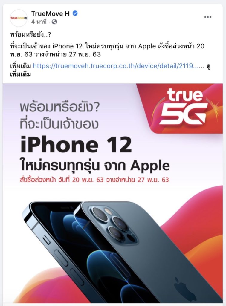 TrueMove H จะเปิดให้จอง iPhone 12 ทุกรุ่นพร้อมกันวันศุกร์ที่ 20 พฤศจิกายน 2563 และวางจำหน่ายในวันที่ 27 พฤศจิกายน 2563 รายละเอียดเพิ่มเติม https://bit.ly/32l1hZo