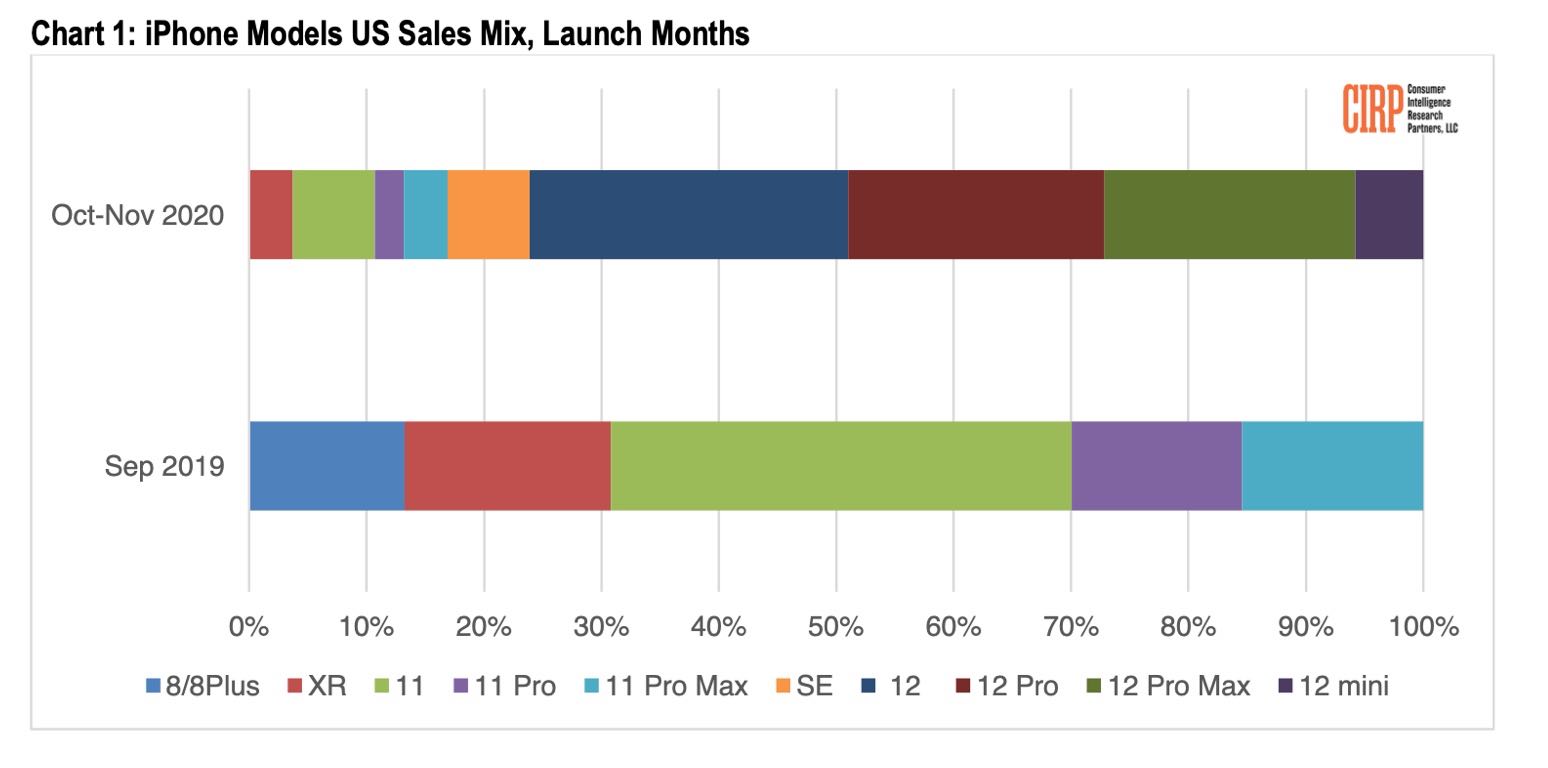 เมื่อเทียบกับช่วงเปิดขาย iPhone 11 ปีที่แล้ว พบว่า iPhone 11 ซีรีส์ มีสัดส่วนการขายอยู่ที่ 69% จากยอดขาย iPhone ทั้งหมด ชี้ให้เห็นว่าในปี 2020 นี้ iPhone 12 ทำยอดขายได้ดีกว่า ส่วนหนึ่งอาจมีผลมาจากการแบ่งรอบการเปิดขาย iPhone 12 ในสหรัฐที่มีอยู่ 2 รอบด้วย