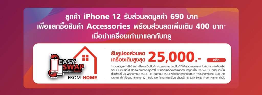 ใครมีเครื่องเก่า ไม่อยากยุ่งยากในการขายต่อก็สามารถนำเครื่องเก่ามาแลก iPhone 12 เครื่องใหม่ได้ ทรูให้ราคาสูงสุดถึง 25,000 บาท ขั้นตอนการแลกก็ง่าย ไม่ต้องเดินทางไปทรูช้อป ไม่ต้องต่อรองราคา เพียงแค่กรอกข้อมูลให้ครบก็ประเมินราคาและแลกเครื่องได้เลย แถมยังได้ส่วนลดมูลค่า 690 บาทสำหรับการซื้ออุปกรณ์เสริมที่ร่วมรายการ ประหยัดได้อีก