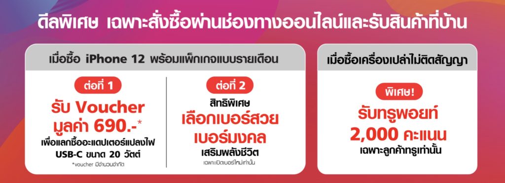 ที่พูดถึงทั้งหมดนี้เป็นไฮไลท์เด่นที่เราพบได้ในการสั่งซื้อ iPhone 12 ทุกรุ่นกับ TrueMove H ซึ่งยังมีสิทธิพิเศษอีกมากมายที่ทางทรูมอบให้กับผู้ที่สั่งซื้อ iPhone 12 ล่วงหน้าในช่วงนี้ ไม่ว่าจะเป็นการเลือกเบอร์สวย, ส่วนลดอุปกรณ์เสริม, รับทรูพอยท์ 2,000 คะแนน, เป็นสมาชิกทรูแบล็คการ์ด 1 ปี, ดูพรีเมียร์ลีกฟรีตลอดฤดูกาล ฯลฯ