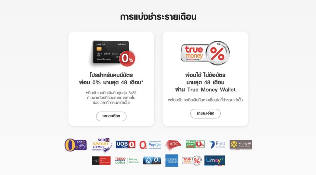 สำหรับคนที่มีบัตรเครดิตที่ร่วมรายการหรือสมัครบริการแบ่งจ่าย True Money ก็สามารถแบ่งชำระ 0% ตั้งแต่ 10 เดือน นานสูงสุดไปจนถึง 48 เดือน และยังได้รับเครดิตเงินคืนสูงสุด 64% กับบัตรเครดิตที่ร่วมรายการ บางบัตรยังได้คะแนนสะสมแลกส่วนลดและเครดิตเงินคืนเพิ่มอีกด้วย ได้หลายต่อกันเลยทีเดียว