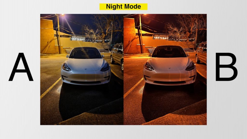 ภาพโหมดกลางคืนที่มีแสงไฟภาพ A ให้โทนสีที่ดูธรรมชาติกว่าภาพ B เนื่องจากภาพ B ให้โทนสีส้มมากกว่า