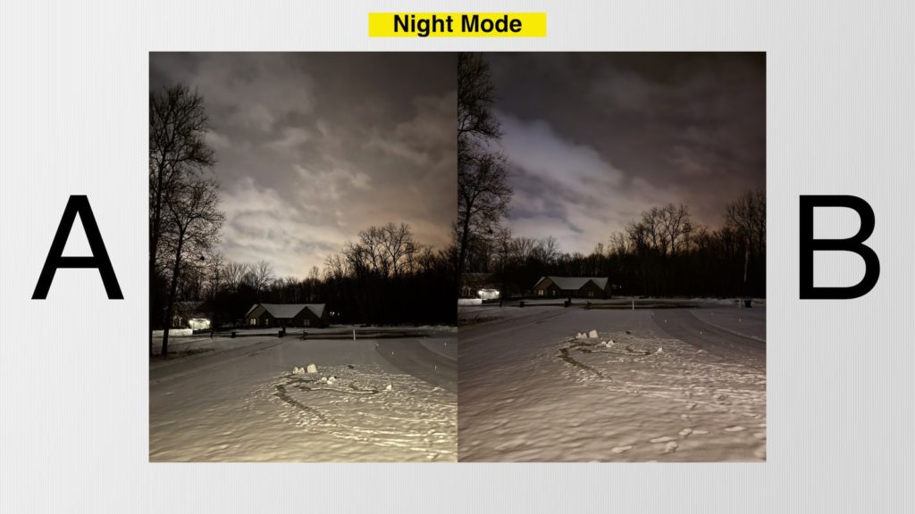 สำหรับโหมดกลางคืน (Night Mode) ภาพ A ดูสว่างและสีสันดูสมดุลกว่าภาพ B ภาพ A มีการเก็บรายละเอียดของท้องฟ้าได้ชัดเจนกว่าภาพ B
