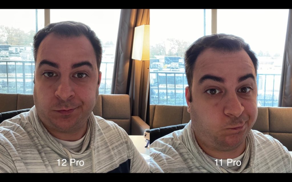 ส่วนกล้องหน้า TrueDepth นั้นก็ได้มีการเปรียบเทียบภาพถ่ายเหมือนกัน กล้องหน้าของ iPhone 12 Pro เป็นกล้อง TrueDepth ความละเอียด 12MP รูรับแสง f/2.2 เหมือนรุ่นเดิม แต่ชิป A14 ช่วยให้กล้องหน้า iPhone 12 Pro รองรับการถ่ายในที่แสงน้อย Night Mode, Deep Fusion, วิดีโอไทม์แลปส์กลางคืน และ Smart HDR 3 รวมถึงบันทึกวิดีโอ Dolby Vision HDR ด้วย ซึ่งการสิ่งเหล่านี้ไม่มีใน iPhone 11 Pro