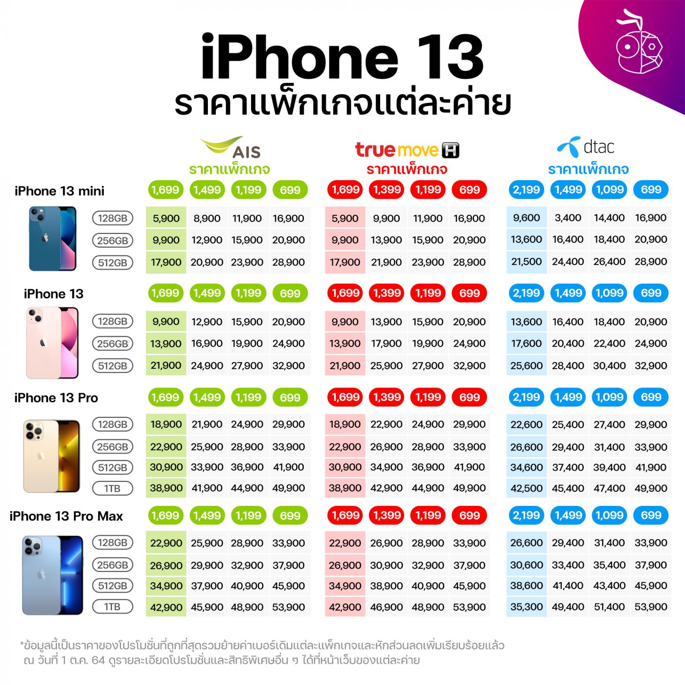 ราคาโปรโมชันนี้เป็นราคาที่ถูกที่สุดของแต่ละค่าย รวมหักส่วนลดต่าง ๆ เช่น ค่าเครื่อง การย้ายค่าย และระยะเวลาติดสัญญา 12 – 24 เดือน ตามแต่ละโปรโมชันของแต่ละค่าย