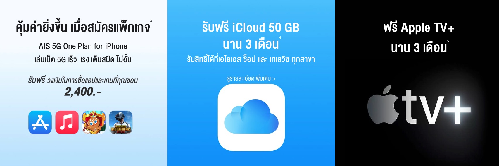- เล่นเน็ต 5G เร็ว แรง เต็มสปีด ไม่อั้น พร้อมรับฟรีวงเงินในการซื้อแอปและเกมที่คุณชื่นชอบ สุงสุด 2,400 บาท เมื่อสมัครแพ็กเกจ AIS 5G One Plan for iPhone 1,699 บาท ขึ้นไป
