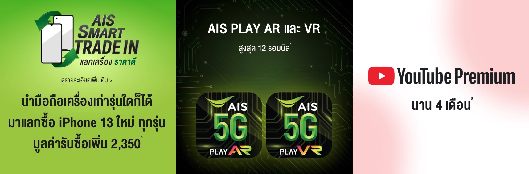 - นำมือถือเครื่องเก่ารุ่นใดก็ได้มาแลกซื้อ iPhone 13 ใหม่ ทุกรุ่นกับ AIS SMART PAY มูลค่ารับซื้อเพิ่มสูงสุด 2,350 บาท