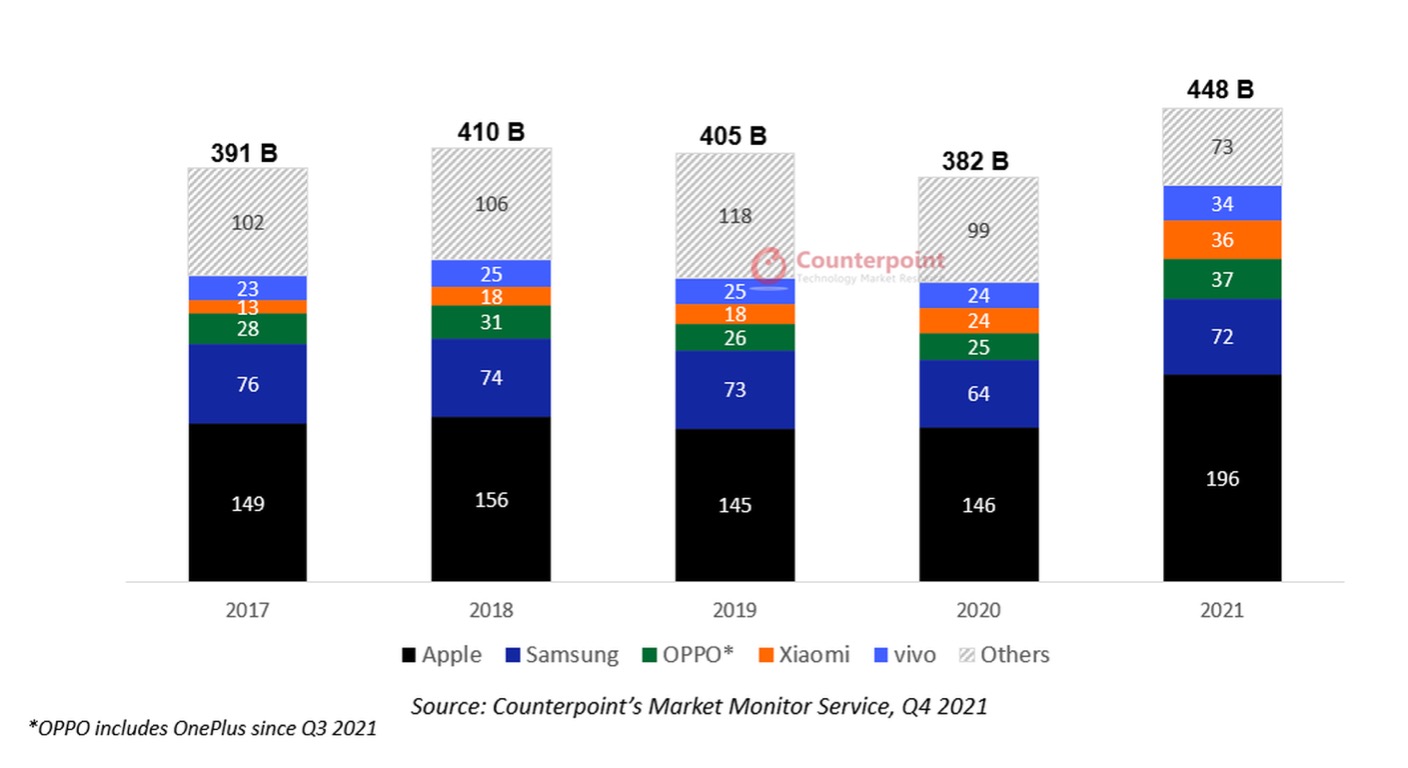 รายงานระบุว่ายอดจำหน่ายสมาร์ตโฟนเติบโตราว ๆ 7% แบบปีต่อปี และเพิ่มขึ้น 12% รายไตรมาสต่อไตรมาส (ไตรมาส 4 ปี 2021) ถึงแม้แบรนด์สมาร์ตโฟนส่วนใหญ่จะเจอปัญหาสินค้าขาดแคลนไม่พอจำหน่ายก็ตาม