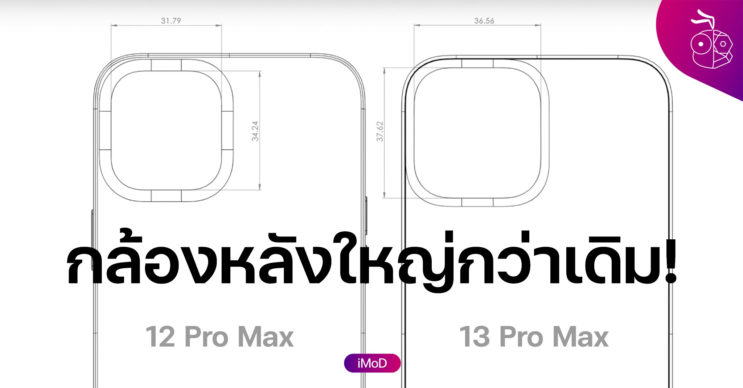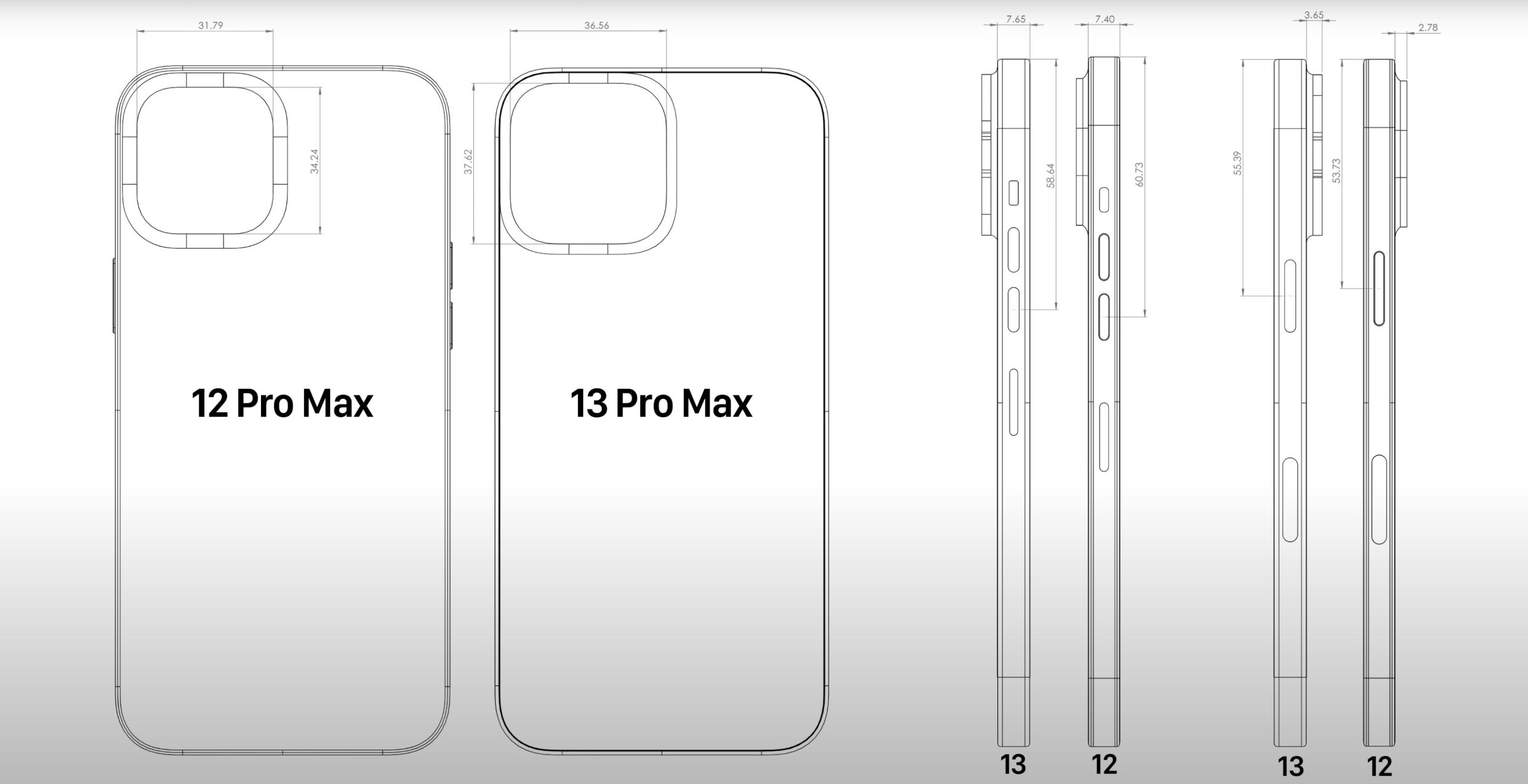 ภาพ CAD ของ iPhone 13 Pro Mac เผยให้เห็นว่า โมดูลกล้องหลัง iPhone 13 Pro Max ยื่นออกมามากขึ้น 0.87 มม. เมื่อเทียบกับ iPhone 12 Pro Max, ทำให้โดยรวมแล้วทำตัวเครื่อง iPhone 13 Pro Max หนาขึ้น 0.25 มม.