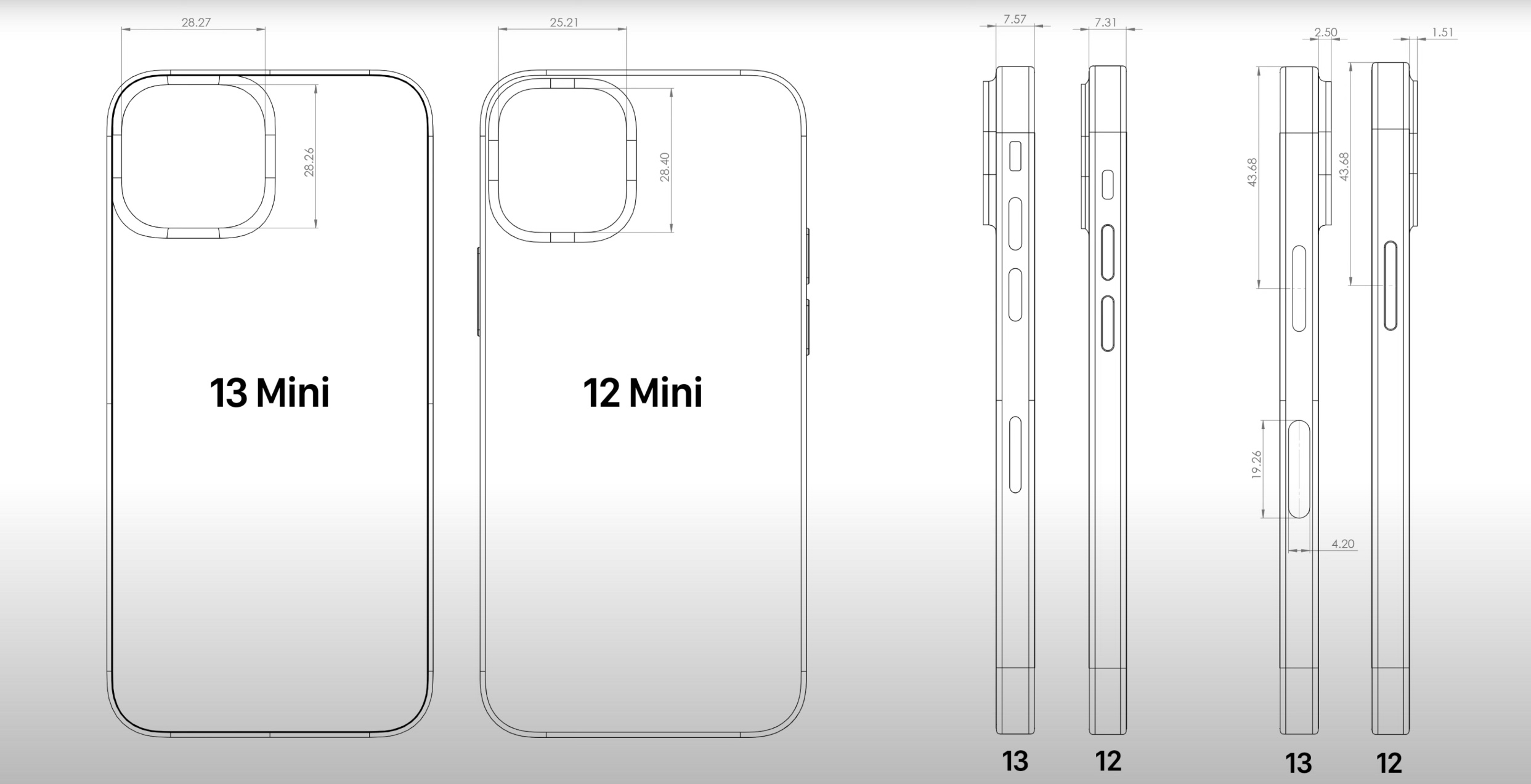ภาพ CAD ของ iPhone 13 mini นั้นพื้นที่กล้องหลังจะกว้างกว่าของ iPhone 12 mini โดยมีความกว้างเพิ่มขึ้น 3.06 มม. แต่มีความสูงลดลง 0.14 มม. และพื้นที่กล้องหลัง iPhone 13 mini จะหนา 0.26 มม.