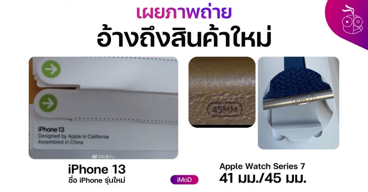 เผยภาพถ่ายระบุชื่อ iPhone 13, สาย​ Apple Watch สำหรับรุ่น 41 มม., 45 มม.