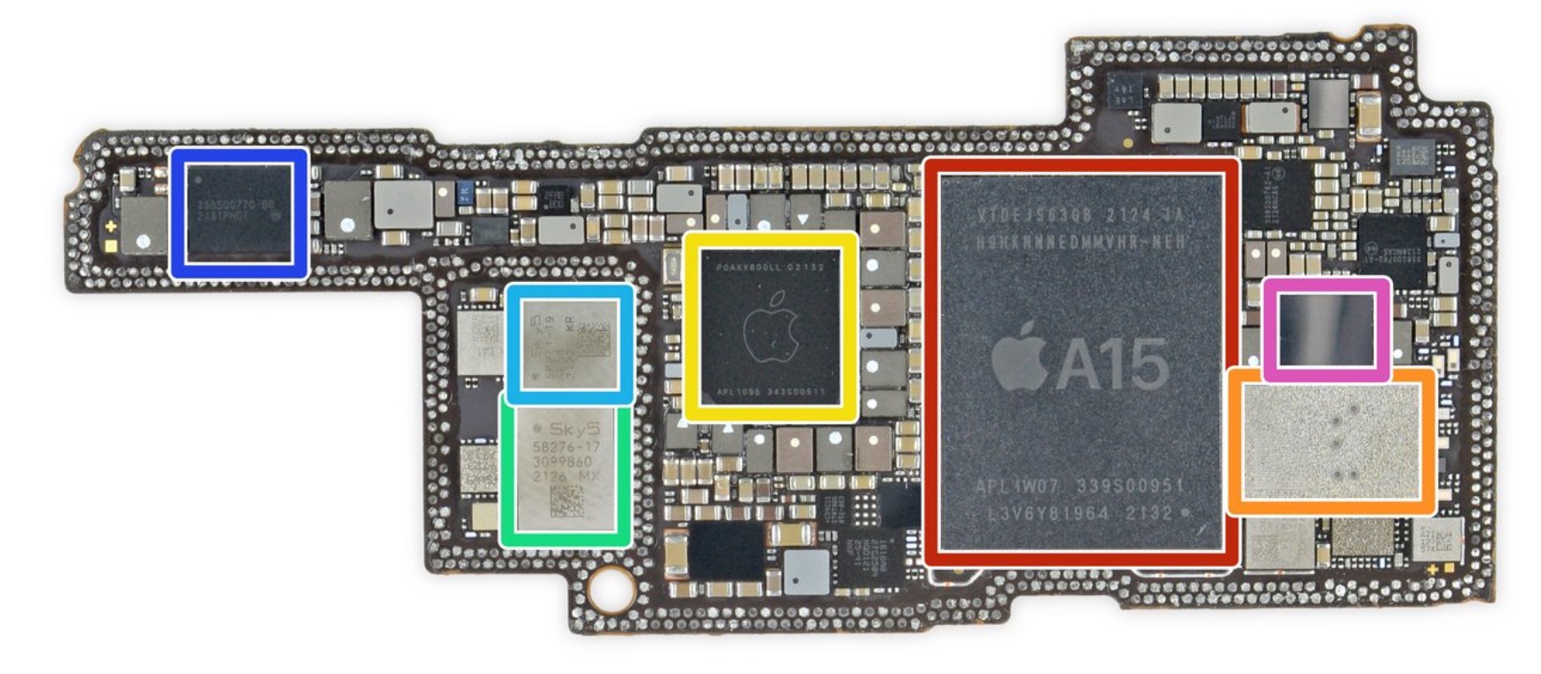 iPhone 13 Pro ใช้ SK Hynix LPDDR4X RAM ขนาด 6GB, มีชิป U1 ultra-wideband, ชิปโมเด็ม Qualcomm SDX60M 5G และใช้ชิปตัวรับ Qualcomm SDR868 5G RF