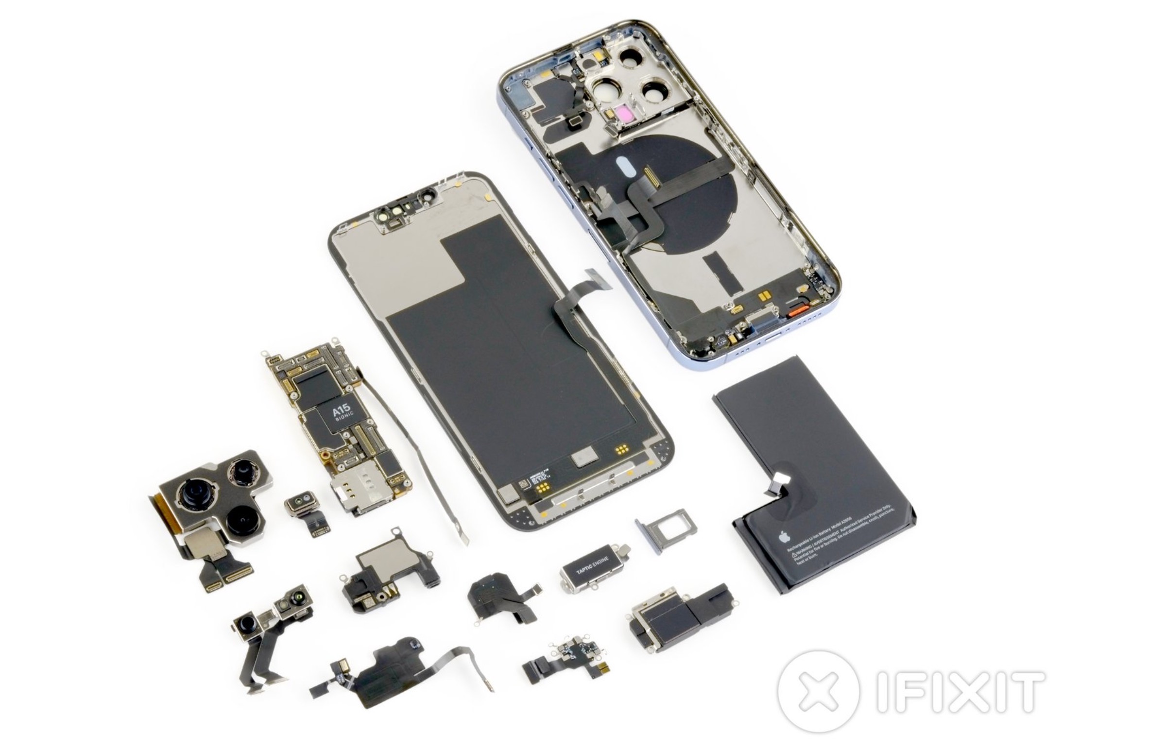 iPhone 13 Pro ย้ายสายเซ็นเซอร์ไปอยู่แถวด้านบน ซึ่งอาจทำให้ขาดได้ระหว่างตอนแกะซ่อม โดยจุดเปลี่ยนแปลงของชิ้นส่วนภายในจุดแรก คือ Taptic Engine มีขนาดเล็กลง แต่มีขนาดหนาขึ้น โดยมีน้ำหนัก 6.3 กรัม เพิ่มขึ้นจากเดิมที่น้ำหนัก 4.8 กรัม
