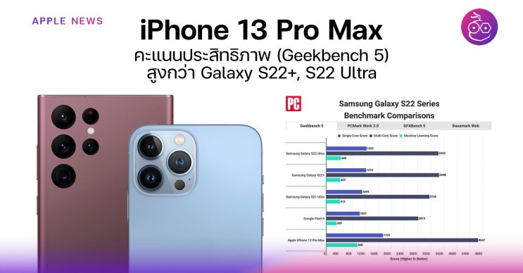 iPhone 13 คะแนนแรงกว่า! – PCMag เผยข้อมูลเปรียบเทียบคะแนนประสิทธิภาพ Geekbench 5 ชี้ว่า iPhone 13 Pro Max มีคะแนนประสิทธิภาพสูงกว่า Galaxy S22+, S22 Ultra รุ่นล่าสุดของ Samsung