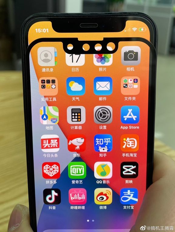 ภาพนี้เผยแพร่โดย DuanRui อ้างอิงว่านำมาจาก Weibo ในภาพเผยให้เห็นฟิล์มของ iPhone 13 ที่มีขนาดรอยบากเล็กกว่าของ iPhone 12