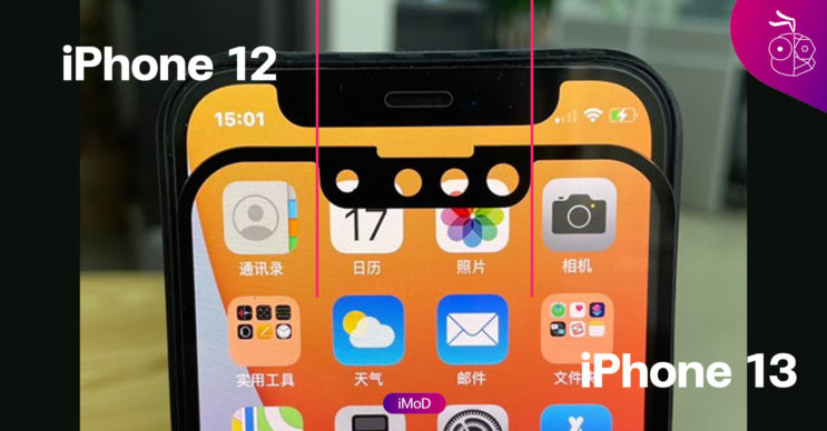 ในภาพเห็นได้ว่าขนาดรอยบากบนฟิล์มของ iPhone 13 นั้นแคบกว่าของ iPhone 12 อยู่ที่ประมาณ 30% ส่วนความลึกนั้นคาดว่าอยู่ในระดับเดียวกัน