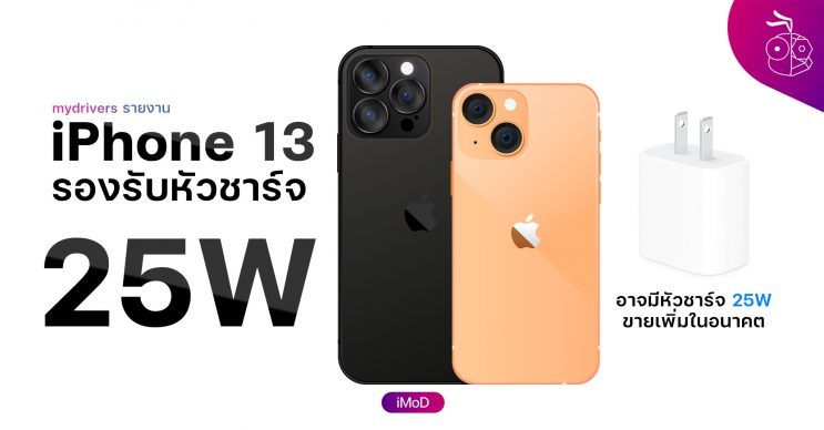 mydrivers (เว็บข่าวจากจีน) รายงานข้อมูลว่า iPhone 13 จะรองรับชาร์จเร็วร่วมกับหัวชาร์จ (อะแดปเตอร์ชาร์จ) ขนาด 25W