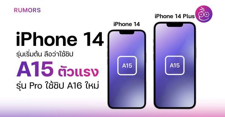 iPhone 14 และ 14 Plus อาจยังใช้ชิป A15 เหมือนเดิม แต่เป็นเวอร์ชันตัวแรงที่เคยอยู่ใน iPhone 13 Pro รีดประสิทธิภาพมากขึ้น ส่วน iPhone 14 Pro และ iPhone 14 Pro Max อาจใช้ชิป A16 ตัวใหม่ที่แรงกว่า