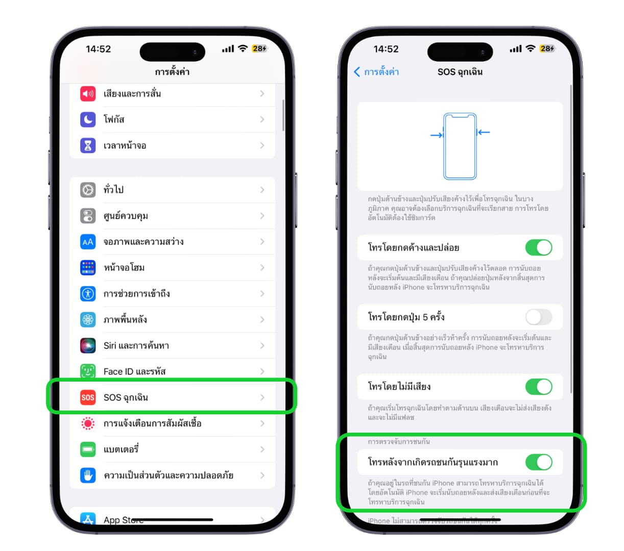 การตั้งค่า > SOS ฉุกเฉิน > เปิด “โทรหลังจากเกิดรถชนกันรุนแรงมาก”