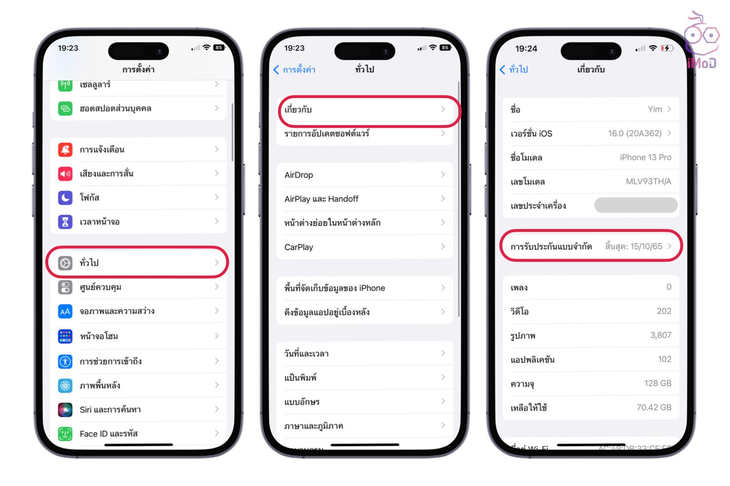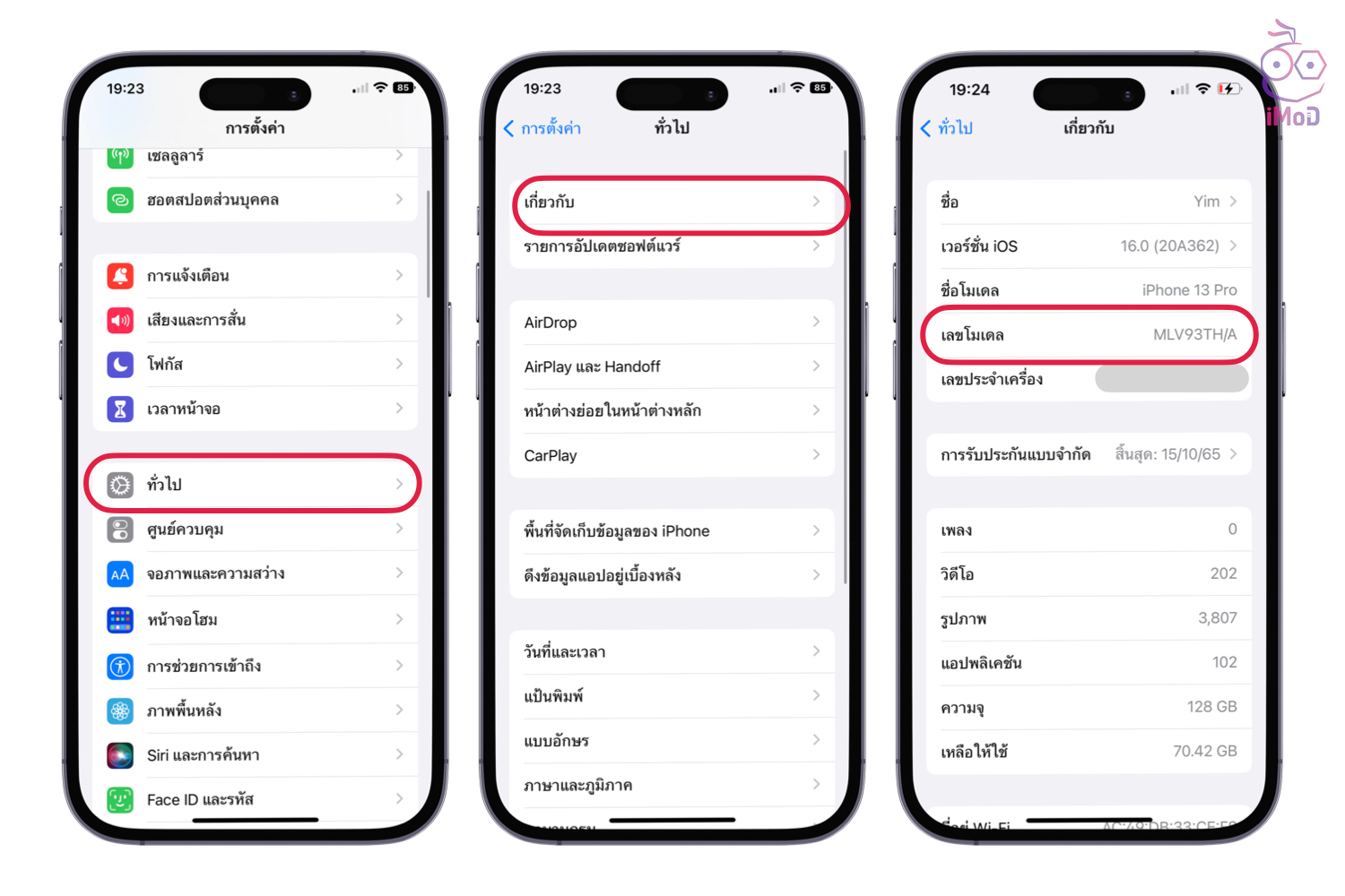 ไปที่ การตั้งค่า (Settings) > ทั่วไป (General) > เกี่ยวกับ (About) > เช็คโมเดล (Model) ถ้าเป็น iPhone เครื่องศูนย์ไทย เลขโมเดลจะต้องลงท้ายด้วย TH เสมอ เช่น MLV93TH/A