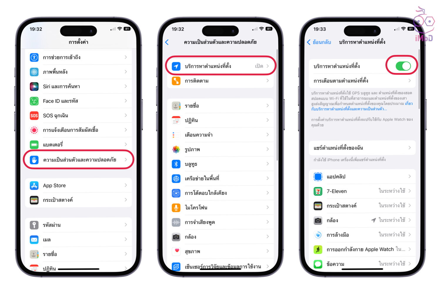 ตั้งค่าเปิด GPS ได้ที่ การตั้งค่า (Settings) > ความเป็นส่วนตัว (Privacy) > บริการหาตำแหน่งที่ตั้ง (Location Services) > เปิด บริการหาตำแหน่งที่ตั้ง (Location Services)
