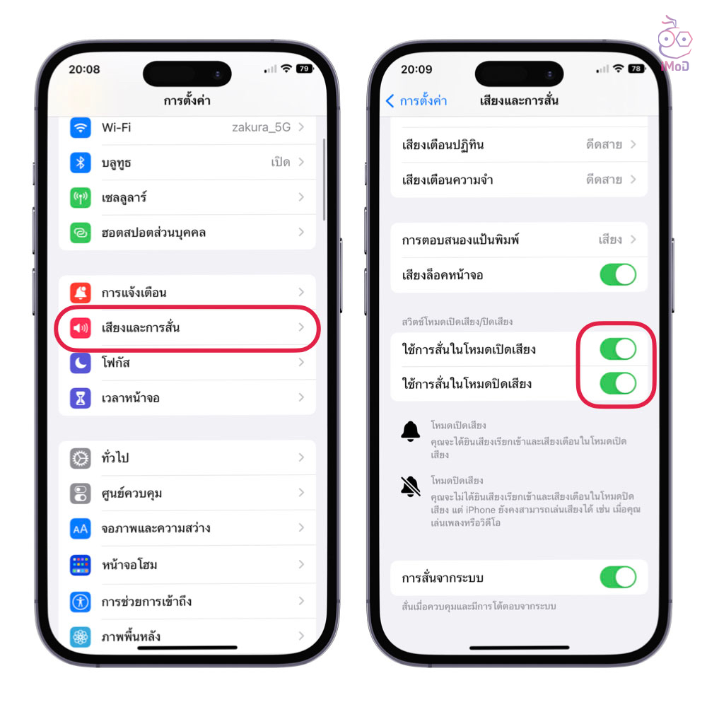 ปุ่มที่ใช้ปรับให้ปิดเสียงเพื่อใช้งานการสั่นจะอยู่ด้านข้างซ้ายของเครื่องเหนือปุ่มปรับเสียง ลองปิดเปิด Vibrate on Ring (สั่นเวลาเสียงเรียกเข้า) และ Vibrate on Silent (สั่นเวลาเงียบ) ถ้าเครื่องสั่นก็ถือว่าปกติ