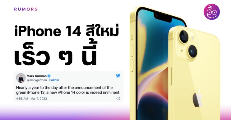 iPhone 14, 14 Plus สีใหม่นั้นรายงานเผยว่าจะเป็นสีเหลือง คาดว่าจะเปิดตัวภายในสัปดาห์นี้ (7 มี.ค. 2023) ซึ่งทาง Mark Gurman ก็โพสต์ใน Twitter ว่า iPhone 14 สีใหม่ใกล้เปิดตัวแล้ว