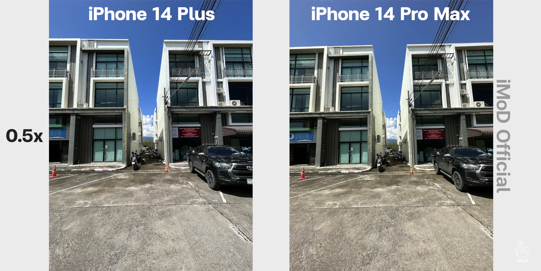 เทียบด้านหลังจะเห็นว่ากล้อง iPhone 14 Plus จะเป็นแบบกล้องคู่ ส่วน iPhone 14 Pro Max นั้น จะมีกล้องทั้งหมด 3 ตัว