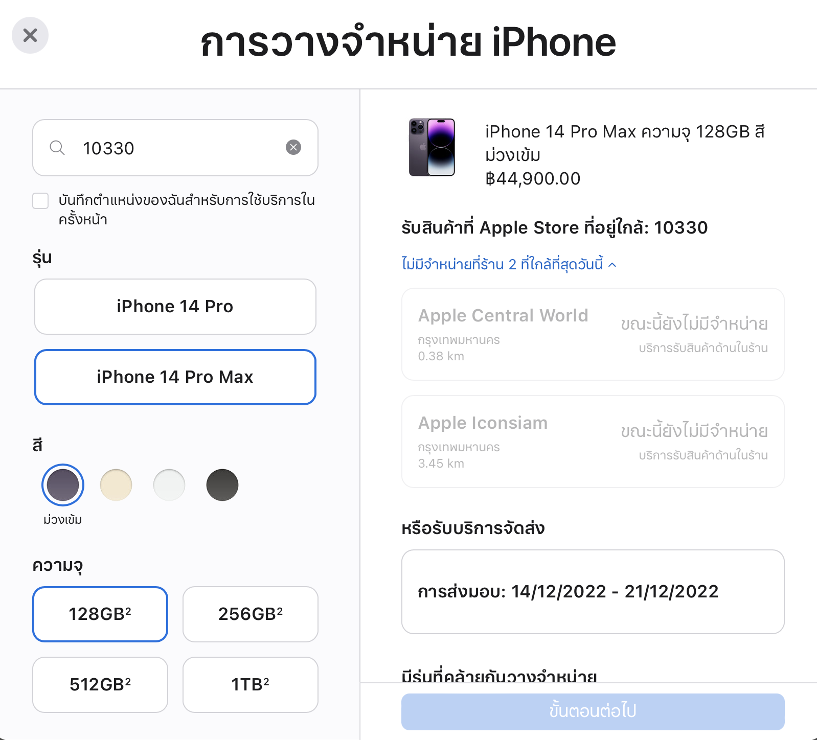 ของเริ่มขาด! iPhone 14 Pro, 14 Pro Max เกือบทุกสี ทุกความจุ สินค้าไม่พร้อมจำหน่ายที่หน้าร้าน Apple Store ไทย, สั่งออนไลน์รอรับของ 1 เดือน
