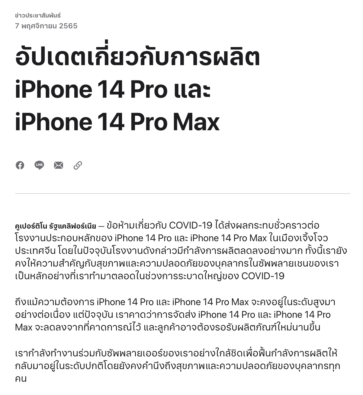 ก่อนหน้านี้ Apple ได้ประกาศว่าจะชะลอการผลิต iPhone 14 Pro, 14 Pro Max เนื่องจากสายผลิตในจีนหยุดการผลิตชั่วคราวเพราะได้รับผลกระทบจากโควิด-19 ที่กลับมาระบาดอีกครั้ง ทำให้ช่วงปลายปีนี้ iPhone 14 Pro, 14 Pro Max สินค้าจะไม่เพียงพอต่อความต้องการ