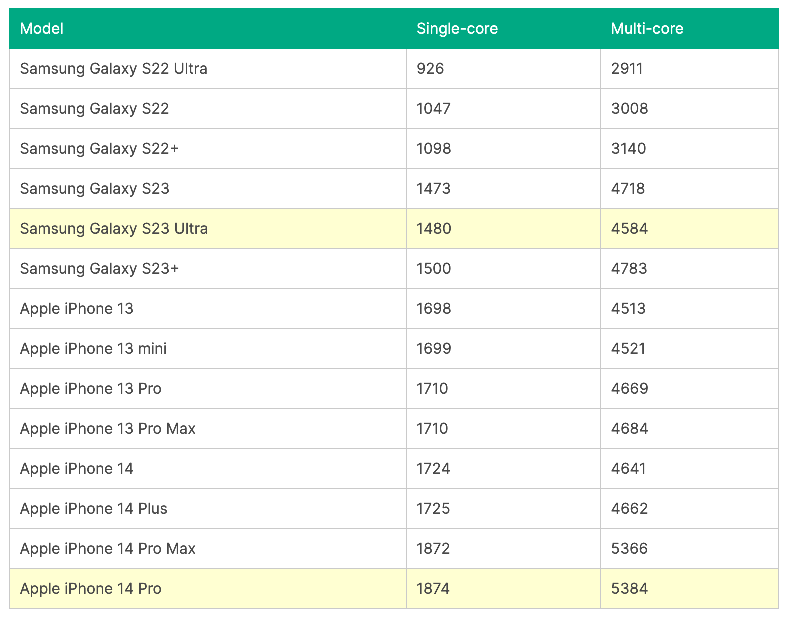 iPhone 14 Pro มีคะแนน Single-Core 1,874 คะแนน, Multi-Core 5,384 คะแนน โดย Galaxy S23 Ultra มีคะแนน Single-Core 1,480 คะแนน และ Multi-Core ที่ 4,584 คะแนน
