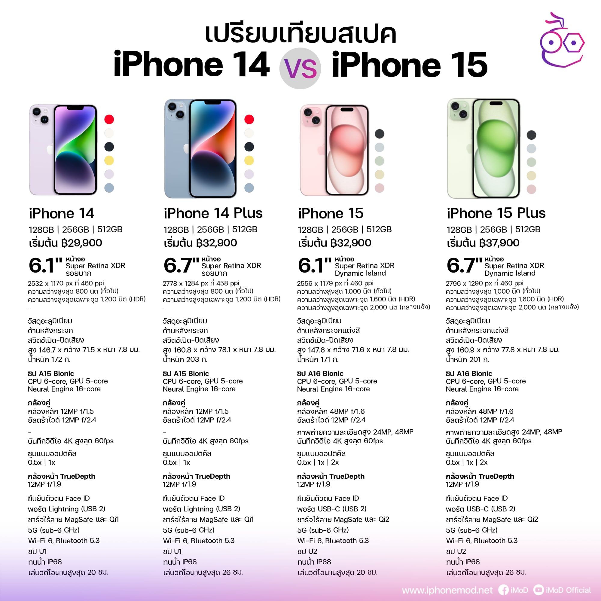 iPhone 15, iPhone 15 Plus ถือว่าเป็นรุ่นที่ได้รับการอัปเกรดค่อนข้างมากเมื่อเทียบกับ iPhone 14, iPhone 14 Plus รุ่นก่อนหน้า ไม่ว่าจะเป็นการเปลี่ยนแปลงครั้งใหญ่อย่างการเปลี่ยนพอร์ตจาก Lightning เป็น USB-C, ดีไซน์ Dynamic Island และการอัปเกรดกล้องหลักเป็น 48MP เป็นต้น ไปชมการเปรียบเทียบสเปคในตารางด้านล่างกันเลย