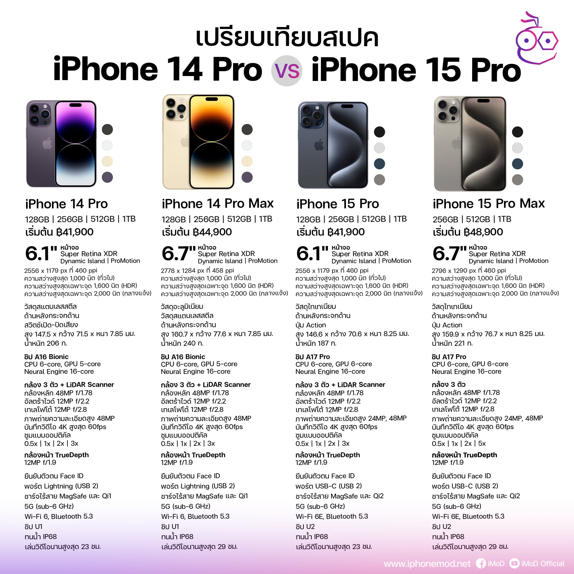 iPhone 15 Pro, iPhone 15 Pro Max ได้รับการอัปเกรดใหม่เรื่องวัสดุตัวเครื่องใช้เป็นกรอบเครื่องไทเทเนียมทำให้มีน้ำหนักเบาลง พร้อมกับการเปลี่ยนผ่านไปใช้พอร์ต USB-C จากพอร์ต Lightning ด้วย ชมเปรียบเทียบสเปคด้านล่างได้เลย