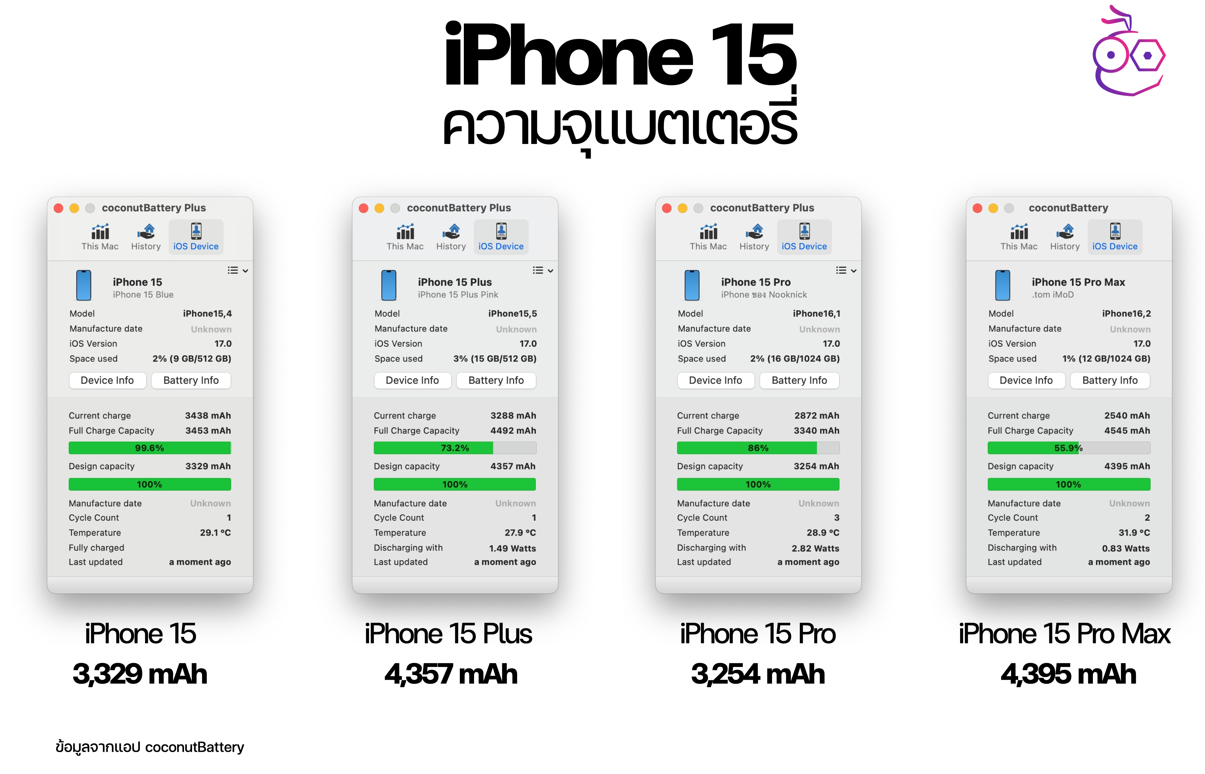 iPhone 15 นั้นมีความจุแบตเตอรี่เพิ่มขึ้น สามารถตรวจสอบข้อมูลอ้างอิงจาก coconutBattery ได้ที่นี่